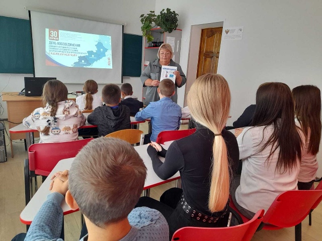В рамках празднования этой даты в Алексеевской филиале дети участвовали в флешмобе «Мы вместе». Дети выстроились с гербами новых территорий и спели песню «Матушка Россия! Позже был проведён классный час, где дети узнали о том, как произошло воссоединение с Россией осенью 2022 года, какой трудный путь прошли жители регионов, отстаивая свое право говорить на русском языке, добиваясь независимости и признания. Обучающиеся работали с тестами и рабочими листами.